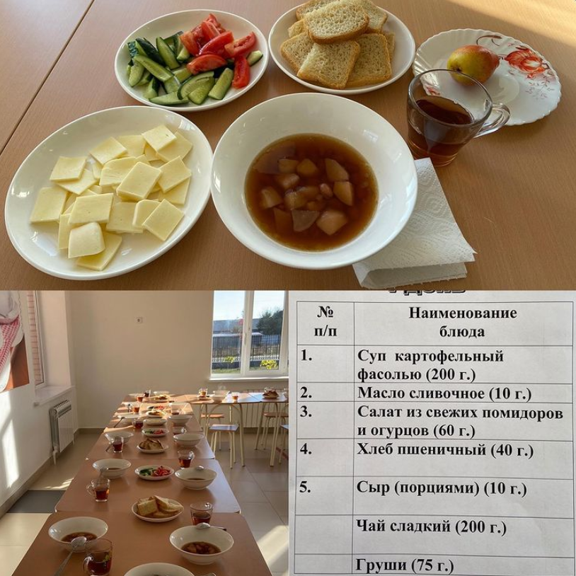 Сегодня в меню был суп с фасолью и картошкой, хдеб с маслом и сыром, а так же салат из огурцов и помидоров