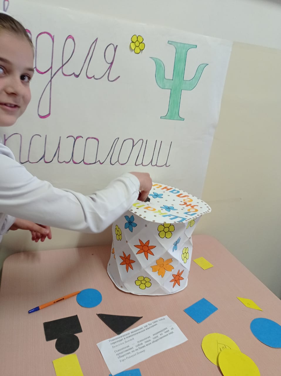 22.04.2022С 18.04.2022 по 23.04.2022 в МБОУ «Сош√1 им. З. С. Абдулаева» прошла Неделя психологии. Целью данного мероприятия было оказание психолого-социальной поддержки учащимся, педагогам, родителям. Неделя имела психологически очерченные начало и конец, основную идею, цитаты на каждый день. События Недели охватили всех обучающихся школы. Мероприятия Недели не мешали учебному процессу, все было обговорено с педагогами и администрацией школы. Особенно понравились обучающимся психологические акции. Основная цель таких акций — расширение жизненного пространства участников за счет внесения в их жизнь новых дополнительных смыслов, чувственных красок, культурных значений.